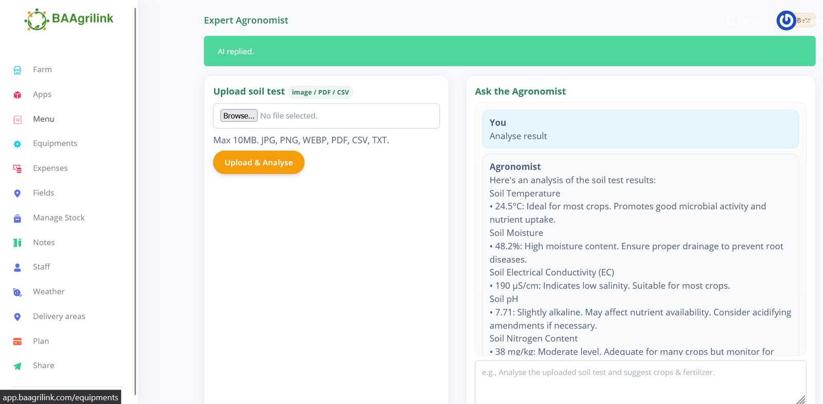 Access your personalized AI Agronomist and intelligent chatbots, designed to provide expert guidance and answer all your agriculture-related questions and inquiries. Beyond that, you can also upload your soil test results to receive a comprehensive analysis along with tailored recommendations.